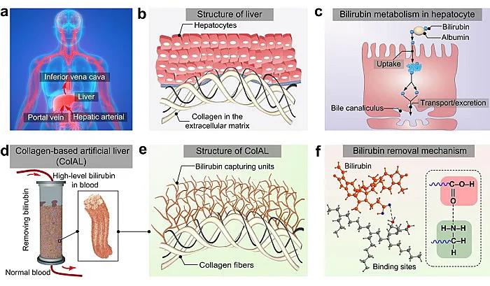胶原基材料因其优异的生物相容性、易于化学修饰等特点,在生物医学领域具有广泛的应用前景。工程实验室石碧院士、廖学品教授团队和郭俊凌教授团队合作,设计并合成了一种胶原基人工肝(ColAL),该人工肝表现出了优异的生物相容性和高性能的胆红素去除能力,在动物实验中展现出了明显的治疗效果。研究成果“Engineered liver-inspired collagen matrix as a