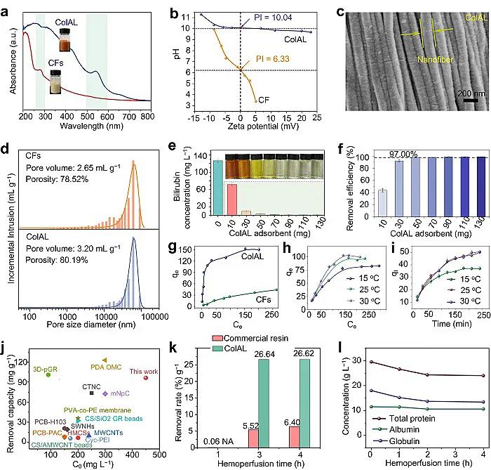 在这项研究中,受到肝结构与胆红素清除性能的构效关系启发,即ECM支撑肝细胞的多尺度结构使肝细胞进行正常的生长分化,本研究首次引入从哺乳动物皮中提取的胶原纤维(I型)作为基本构建模块,设计了一种胶原基人工肝(ColAL),其具有良好的生物相容性且可高效去除血液中的胆红素。ColAL对胆红素有较大的吸附去除能力(去除率高达97%)(图2)。同时,利用牛血清模拟高胆红素血症患者血液进行灌流试验,相同质量下,ColAL(26.62%)比商业树脂(6.40%)具有更高的胆红素去除效率,且灌流后仍能较好地保留血清中的蛋白质。