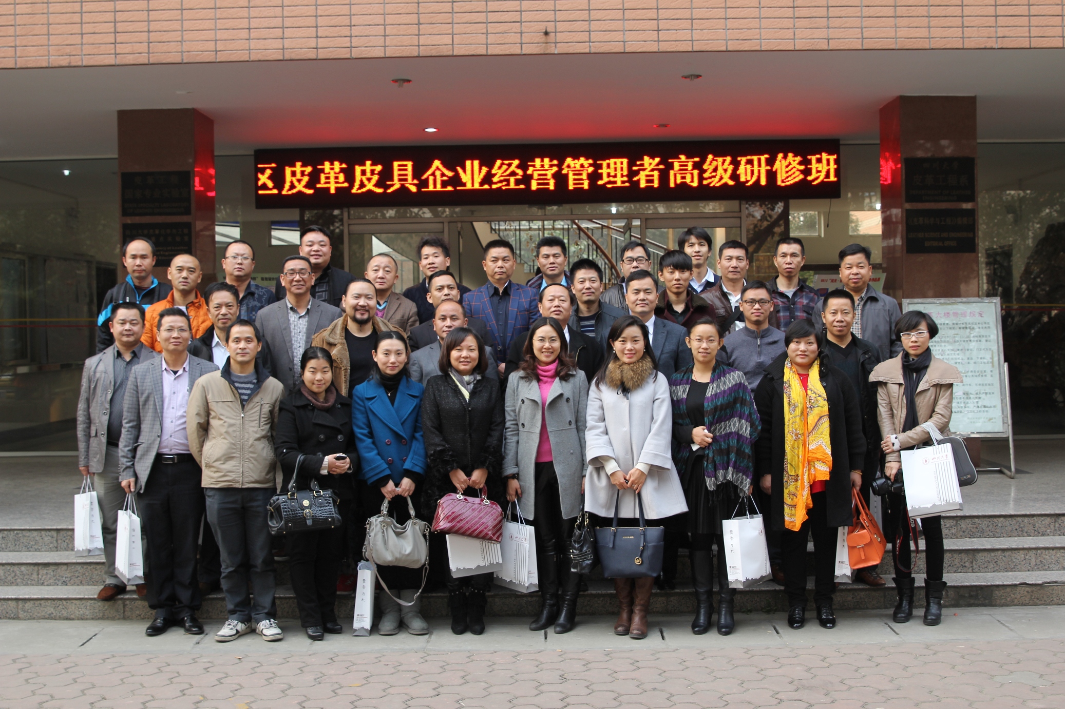 2013年12月12-15日,广州市花都区人力资源与社会保障局牵头组织的广州花都区皮革皮具企业经营管理者高级研修班在四川大学制革清洁技术国家工程实验室成功举办。该班近40名学员全部为花都区皮革皮具公司的总经理或高管。