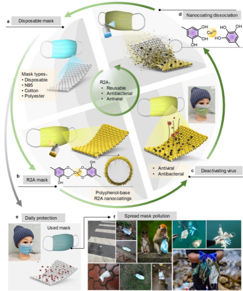 图2. 植物多酚功能化防护口罩的抗菌抗病毒、重复使用机理,以及市售防护口罩的防护机理及其环境污染