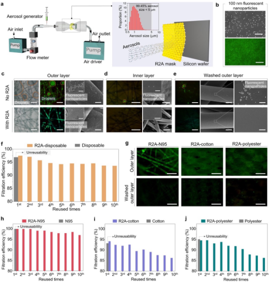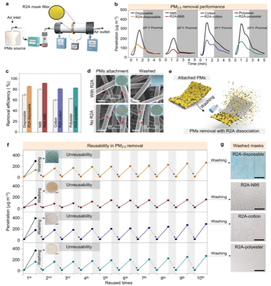 图3. 植物多酚功能化口罩对含有模拟病毒纳米颗粒的气溶胶的过滤性能以及重复使用性能