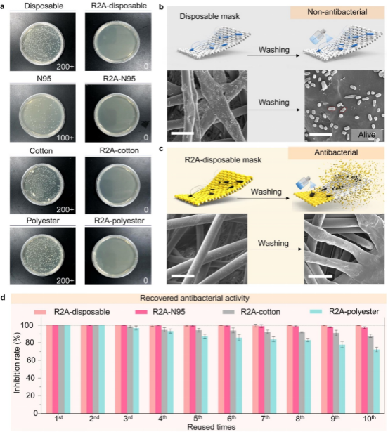 将抗菌性能赋予标准口罩可以为预防由细菌引起的呼吸道疾病和常见细菌性皮肤感染提供必要的防护措施。植物多酚功能化口罩的抗菌性能测试结果表明,植物多酚功能化口罩对大肠杆菌(E. coli)具有强杀灭能力,抑制率高达99%(图4)。此外,在用弱酸溶液清洗后,植物多酚功能化口罩的纳米涂层会分解,同时附着的细菌碎片随之被去除。而且,经过重新构建植物多酚基纳米涂层后,功能化口罩依然对大肠杆菌表现出强的抑制能力。