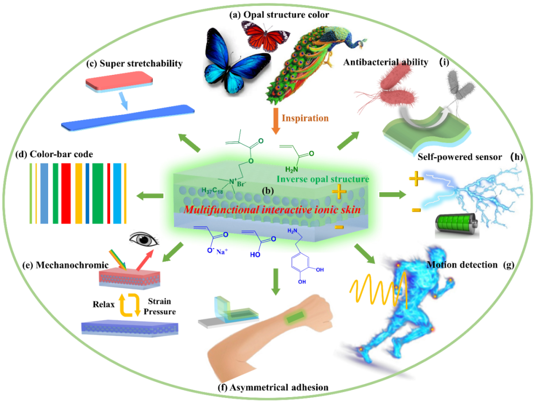 生物皮肤是生物体直接与外界环境接触的智能器官,具有保护、感知、伪装和通讯等多种功能。受生物皮肤的启发,科研人员设计了许多智能仿生皮肤,包括电子皮肤、离子皮肤和光子皮肤。离子皮肤是一类新型智能材料,它可以通过模仿生物皮肤的离子传导机制来感知各种外部刺激(如应变、压力和振动等),在人体运动监测和健康管理等众多应用领域引起了人们广泛的关注。目前,关于离子皮肤的研究均致力于提高材料的拉伸延展性和单一电信号传感的灵敏度和稳定性。然而,对于可穿戴材料所需的可视化显示、多信号传感以及特定的多功能性(如异质黏附、抗菌、防伪和自供电等)一直被研究人员所忽视。这极大的限制了离子皮肤在人机交互和智能穿戴领域的实际应用。