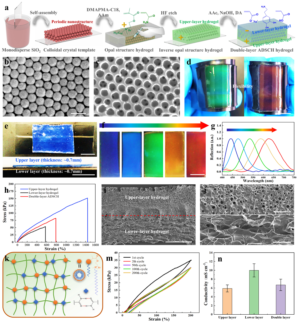 鉴于此,工程实验室金勇教授团队受到自然界生物皮肤的启发,首次通过一种不对称的双层结构色水凝胶(ADSCH),成功实现了同时具有异质黏附、抗菌、防伪和自供电功能的光电双信号传感的交互式离子皮肤(如图1)。其中,ADSCH的上层是通过牺牲模板法制备的具有反蛋白石结构的聚阳离子(疏水性季铵盐-丙烯酰胺)水凝胶。下层是在上层基础上通过层层逐步聚合制备的聚阴离子(丙烯酸-丙烯酸钠)/聚多巴胺水凝胶。