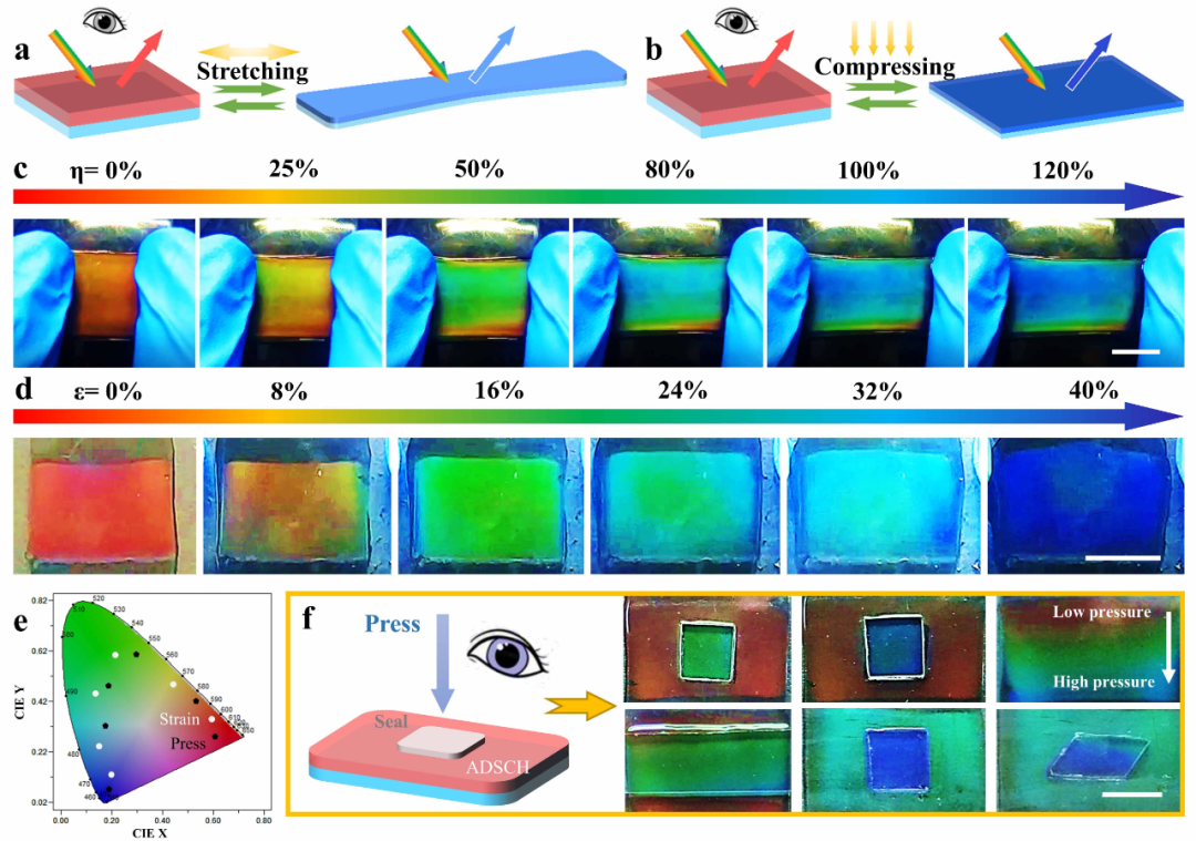 图3. 交互式仿生离子皮肤的机致变色响应。