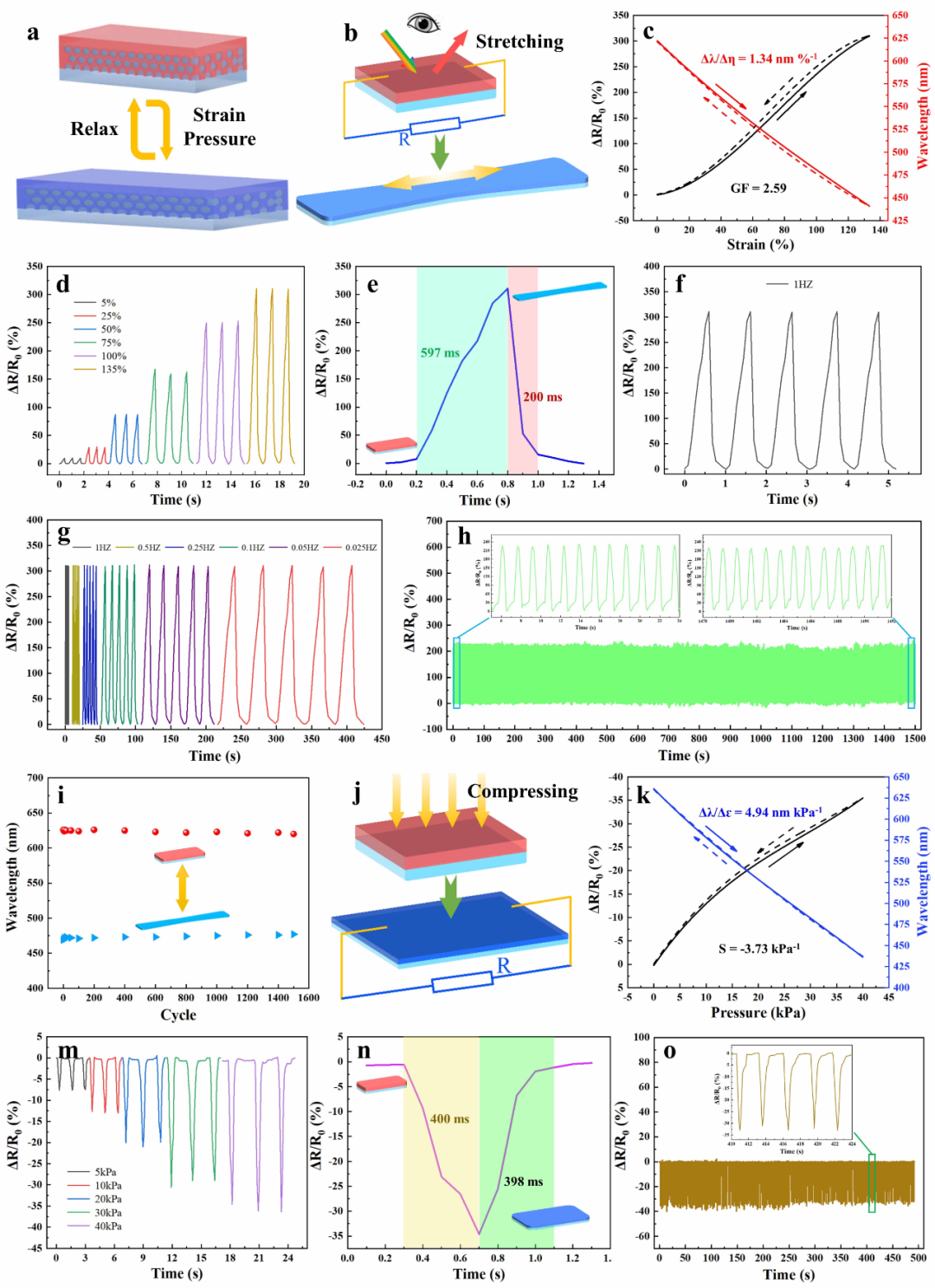 所得到的交互式离子皮肤具有良好的柔韧性、出色的拉伸延展性(~800%)、良好的导电性(~6 ms cm-1)及鲜艳的结构色。由于离子聚合物优异的离子传导性和水凝胶内反蛋白石结构引起的结构色,该离子皮肤不仅可以通过改变相对电阻来显示电信号,还可以根据光子晶体晶格间距的调整提供可视化的光信号。因此,该离子皮肤可以同时通过视觉颜色和相对电阻变化来监测外界张力(GF:2.59;响应时间:597 ms;机致变色灵敏度:1.34 nm %-1)和压力(灵敏度:-3.73 kPa-1;响应时间:400 ms;机致变色灵敏度:4.94 nm kPa-1)。
