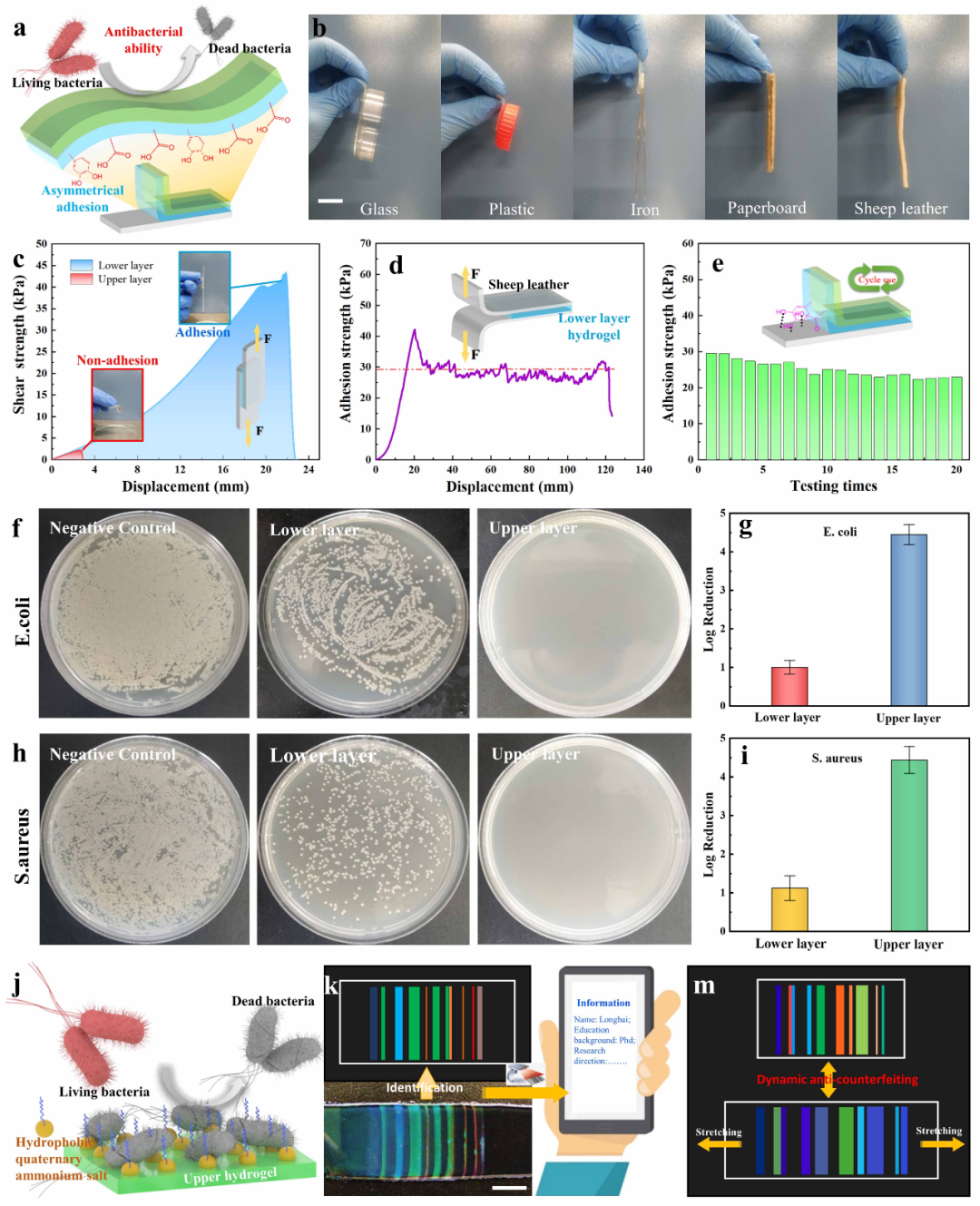 图5. 交互式仿生离子皮肤的异质黏附、抗菌及彩色条形码功能。