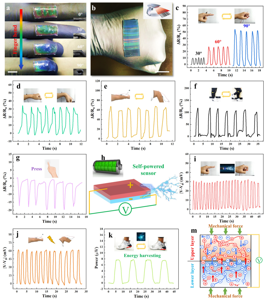 图6. 交互式仿生离子皮肤用于可视化监测及自发电传感。