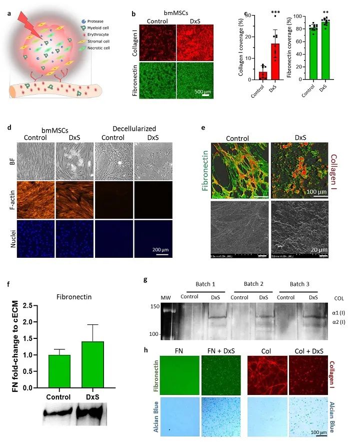 慢性缺血性疾病,如冠状动脉、脑血管和外周血管疾病,是造成全世界死亡和残疾的主要原因。相关组织区域血管生长不足会导致灌注不良,进而导致组织坏死,会进一步阻碍组织再生和伤口愈合。现有的血管重建策略,包括血管生长因子递送和干细胞治疗,尚存在生长因子代谢速度快、剂量不稳定以及移植细胞培养周期长、病灶部位能量供应不足导致细胞死亡等缺点。细胞外基质为血管生长因子的存储与可控释放提供了合适的载体,而MSCs能产生多种细胞因子(包括血管生长因子)。因此,该研究团队将硫酸葡聚糖加入到MSCs培养基中促进细胞外基质和活性细胞因子的分子自组装,其中硫酸葡聚糖刺激MSCs分泌胶原基ECM相关蛋白(如I型胶原和纤连蛋白)(如图2所示),该蛋白进一步组装成为具有生物学活性的纳米颗粒。