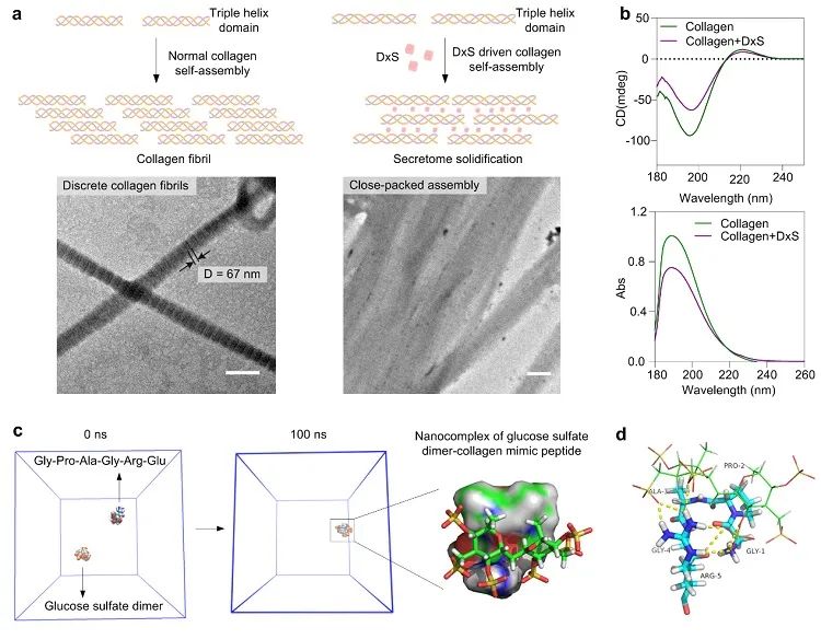 研究团队通过透射电镜、圆二色谱和分子动力学模拟验证了硫酸葡聚糖与细胞外基质(主要成分I型胶原)的相互作用(图2)。结果发现加入硫酸葡聚糖之后,I型胶原中的胶原原纤维堆积更加紧密,同时这种密堆积结构并没有影响胶原的活性。分子动力学计算结果显示硫酸葡聚糖与胶原原纤维之间主要通过范德华力、氢键和静电相互作用结合。