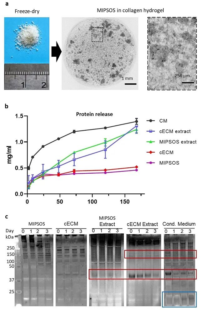 研究团队进一步评价了该体系中活性蛋白质释稳定性(图3)。实验通过检测水凝胶上清液中蛋白质含量,结果发现在cECM和MIPSOS中萃取所得的蛋白质能稳定而迅速地释放。降解实验表明MIPSOS体系能保护包裹于其中的活性蛋白并使其降解速度减慢。