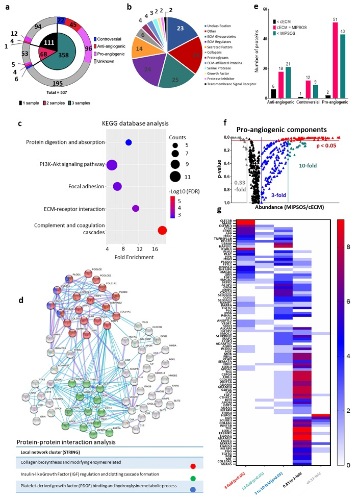研究MIPSOS的体内活性发现,通过MIPSOS治疗后,小鼠伤口处再生血管数量显著多于对照组(图5)。另外,MIPSOS治疗后伤口愈合速度明显高于对照组。蛋白质组学实验验证了,MIPSOS中细胞因子的含量要远远大于普通ECM中细胞因子含量,这主要是因为MIPSOS具有更好促进伤口愈合的能力(图6)。这种方法将为基于负载细胞源性分泌因子合成具有特定生物活性的新型生物材料开辟新道路,解决干细胞治疗过程中细胞活性难以维持的局限性。同时,该研究结果突出了一种基于颗粒的可存储平台开发,为解决一系列关于血管重建的临床挑战提供更好的促血管生成途径。