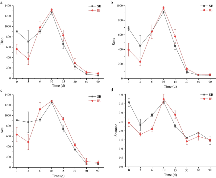 图1 不同时间点盐湿皮微生物在Chao (a)、Sobs (b)、Ace (c) 和Shannon (d) 指数下的Alpha多样性