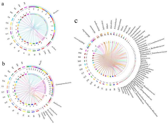 图2 不同时间点盐湿皮微生物样本与物种丰度关联circos弦装图:(a) 域水平;(b) 纲水平;(c) 属水平