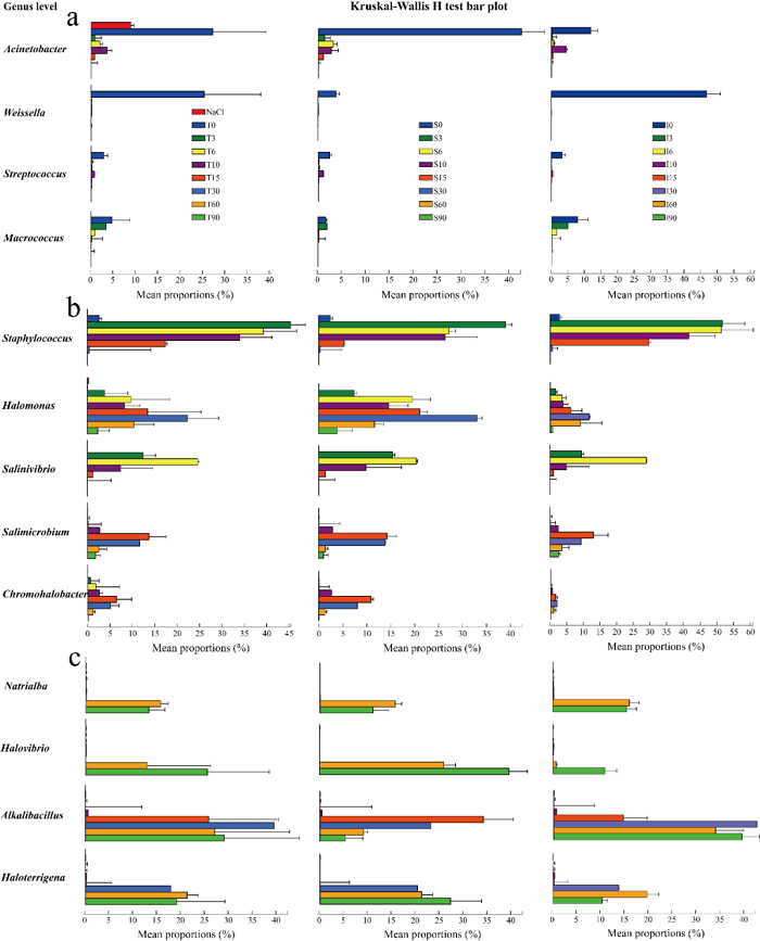 图3 盐湿羊皮上典型普通微生物 (a)、中度嗜盐菌 (b) 和极端嗜盐菌 (c) 的相对丰度变化