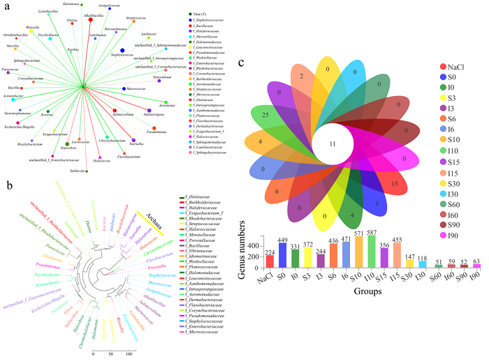 图4 盐湿皮微生物的相关性分析:(a) 盐湿皮微生物与时间的相关性网络图;(b) 盐湿皮上微生物间的系统进化关系;(c) 17组微生物样本中独有和共有细菌的组成