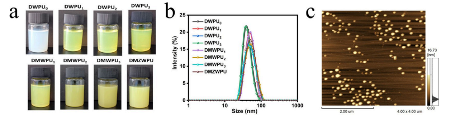 图 2:(a) DWPUx、DMWPUy和 DMZWPU 乳液的光学图像。(b) DWPUx、DMWPUy 和 DMZWPU 乳液的粒径分布曲线。(c) DMZWPU 乳液的形貌图像。