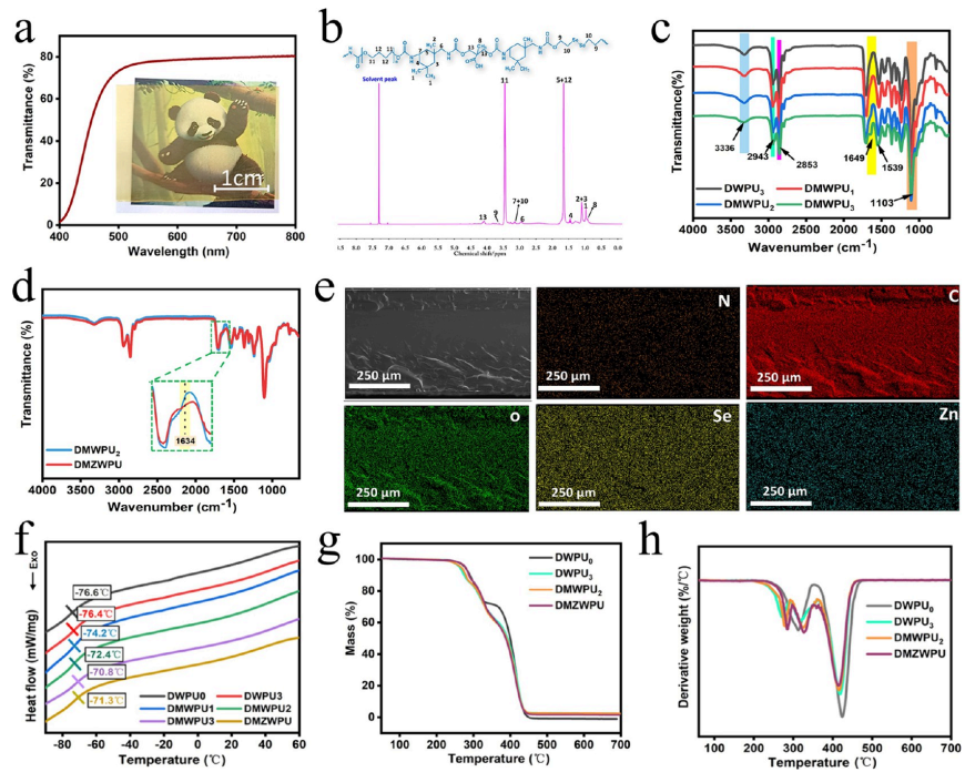 图 3:(a) DMZWPU 薄膜在可见光区域(400−800 nm)的透光率及其光学图像。(b) DWPU3 薄膜的 ¹H NMR 谱图。(c) DWPU3 和 DMWPUy 薄膜的 FT-IR 谱图。(d) DMWPU2 和 DMZWPU 薄膜的 FT-IR 谱图。(e) DMZWPU 薄膜的 EDS 映射图。(f) DWPUx、DMWPUy和 DMZWPU 薄膜的 DSC 曲线。(g) DWPU0、DWPU3、DMWPU2和 DMZWPU 薄膜的 TG 曲线和 (h) DTG 曲线。