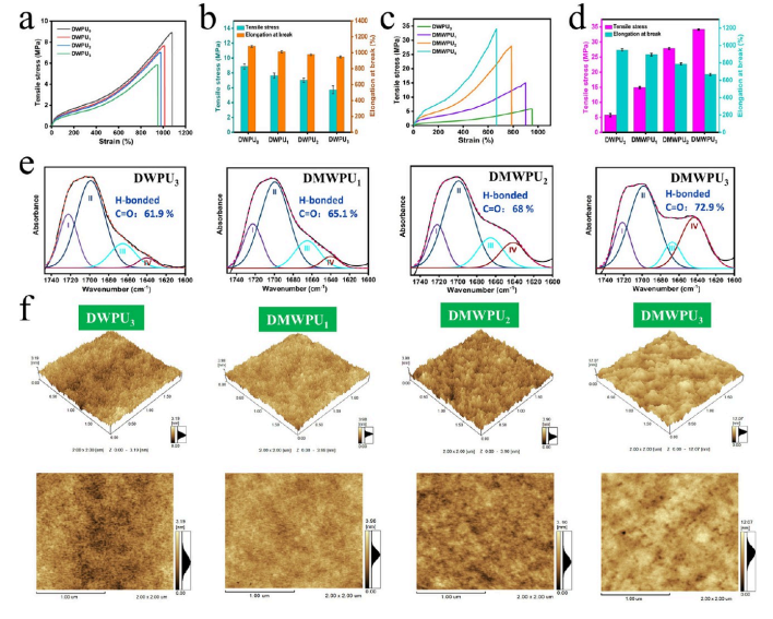 图 4:(a) DWPUx 薄膜的代表性应力-应变曲线。(b) DWPU0 和 DWPUx 薄膜的拉伸应力和断裂伸长率的直方图。(c) DMWPUy 薄膜的代表性应力-应变曲线。(d) DMWPUy 薄膜的拉伸应力和断裂伸长率的直方图。(e) DWPU3 和 DMWPUy 薄膜红外光谱中羰基区域的拟合结果。(f) DWPU3 和DMWPUy 薄膜的 3D 和 2D AFM 高度图像。