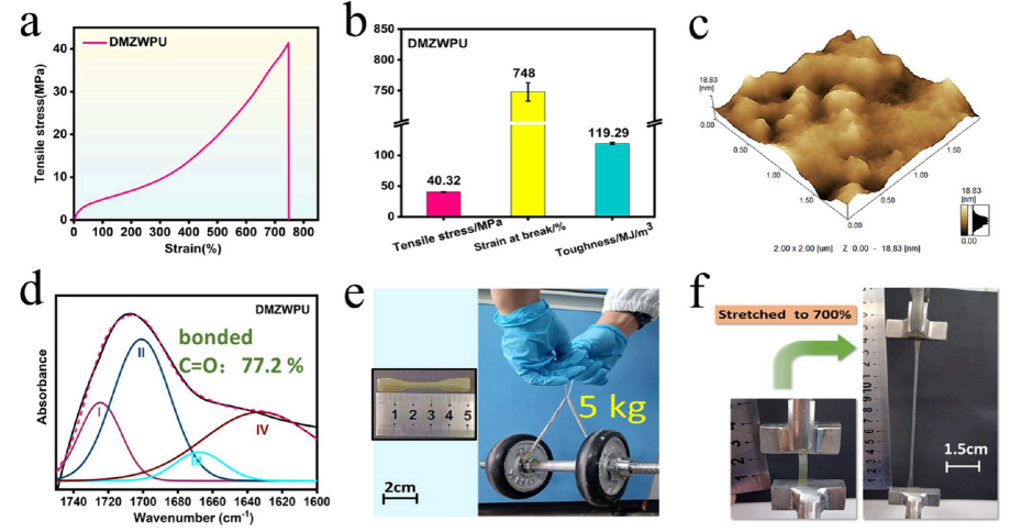 图 5:(a) DMZWPU 薄膜的代表性应力-应变曲线。(b) DMZWPU 薄膜的拉伸应力、断裂伸长率和断裂韧性直方图。(c) DMZWPU 薄膜的 3D AFM 高度图。(d) DMZWPU 薄膜红外光谱中羰基区域的峰拟合结果。(e) DMZWPU 薄膜(尺寸:50 mm × 4 mm × 0.5 mm)提起一个 5 kg 哑铃。(f) DMZWPU 薄膜被拉伸至原始长度的 700%。