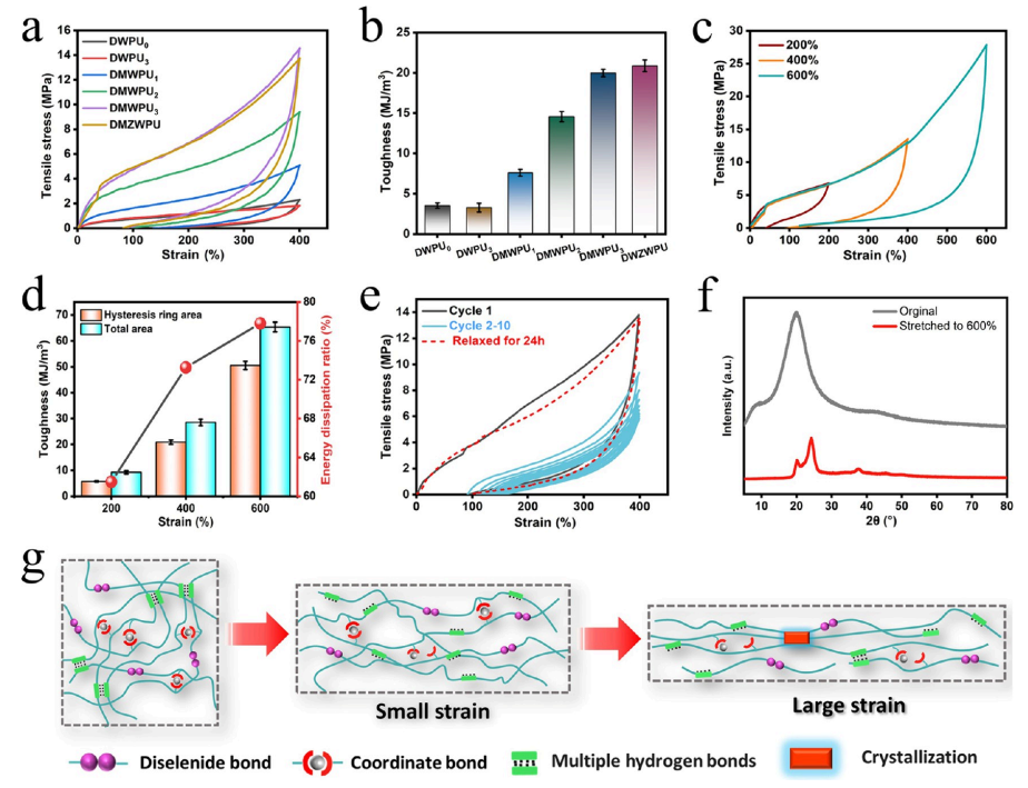 图 6:(a) DWPU0、DWPU3、DMWPUy 和DMZWPU 薄膜在 400% 应变下的循环拉伸应力-应变曲线和 (b) 对应的耗散能量。(c) DMZWPU 薄膜在不同应变(200%、400%、600%)下的循环拉伸应力-应变曲线和 (d) 对应的耗散能量和能量耗散率。(e) DMZWPU 薄膜经过 10 次连续循环拉伸过程后和在室温下松弛 24 小时后的应力-应变曲线。(f) 未拉伸和拉伸 600% 的 DMZWPU 薄膜的 XRD 曲线。(g) DMZWPU 薄膜的增强和增韧机制。