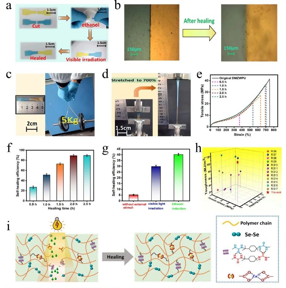 图 7:(a) DMZWPU 薄膜的自修复过程。(b) 修复前后 DMZWPU 薄膜表面微裂纹的显微照片。(c) 修复后的 DMZWPU 薄膜可以提起 5 kg 哑铃。(d) 修复后的 DMZWPU 薄膜可以拉伸至原始应变的 700%。(e) DMZWPU 薄膜在不同修复时间下的应力-应变曲线。(f) DMZWPU 薄膜在不同修复时间下的自修复效率。(g) 不同条件下 DMZWPU 薄膜的自修复效率。(h) DMZWPU 样品与已报道的室温自修复聚合物(修复效率 >80%)在拉伸应力、韧性和修复时间方面的比较(详细数据见表 S1)。