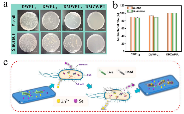 图 8:(a) 经DWPU0、DWPU3、DMWPU2 和DMZWPU 薄膜处理后,E. coli 和 S. aureus 在琼脂平板上存活的光学图像。(b) DWPU0、DWPU3、DMWPU2 和DMZWPU 薄膜对 E. coli 和 S. aureus 的抗菌率 (%)。(c) DMZWPU 薄膜的抗菌机制示意图。