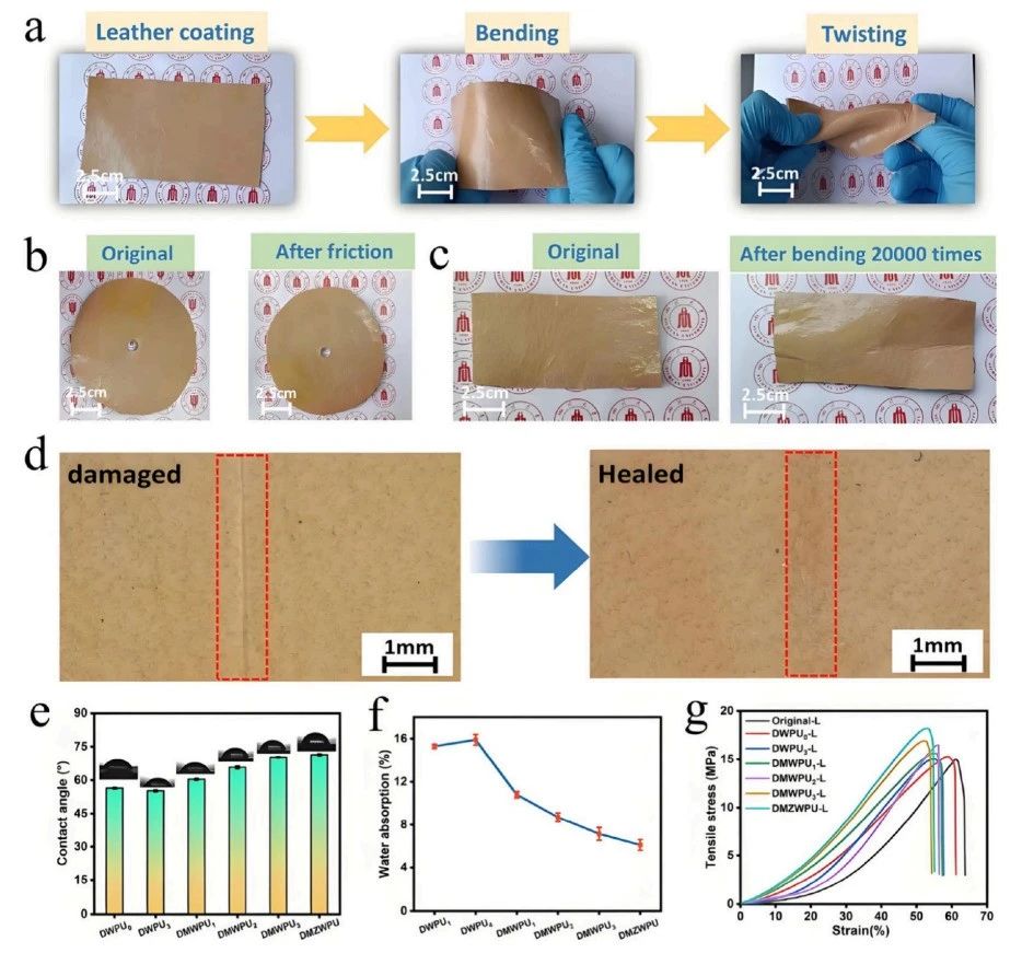 图 9:(a) 经DMZWPU 乳液涂饰后的皮革样品。(b) 涂饰前后的皮革样品经过磨损测试。(c) 涂饰前后的皮革样品经过弯曲测试。(d) 皮革涂层表面划痕的室温自修复行为。(e) DWPUx、DMWPUy 和DMZWPU 薄膜样品的水接触角和 (f) 吸水率 (%)。(g)用不同 WPU 样品涂饰后的皮革的物理和机械性能。