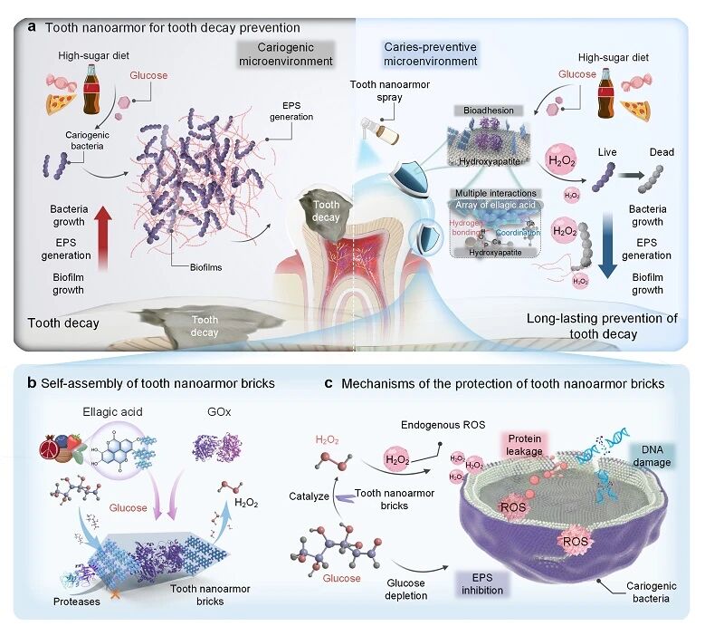 图1. 自组装“牙齿纳米盔甲”长效预防龋病示意图