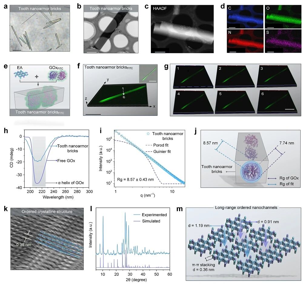 光学显微/透射电镜及元素EDS分析证实“牙齿纳米盔甲”构建单元呈现规则棒状结构,且C/O/N/S元素均匀分布(图2a-d)。利用FITC标记的GOx进行自组装后,激光共聚焦z轴切片显示GOx在框架内均一分布(图2e-g)。圆二色谱显示“牙齿纳米盔甲”构建单元保留211 nm特征,表明GOx的α螺旋结构未被破坏(图2h)。小角X射线散射拟合得到介孔尺度可容纳单个GOx(图2i-j)。高分辨透射电子显微镜观察到EA分子π–π堆积(~0.35 nm)(图2k),粉末X射线衍射实验与模拟吻合并揭示有序纳米通道结构(图2l、2m)。