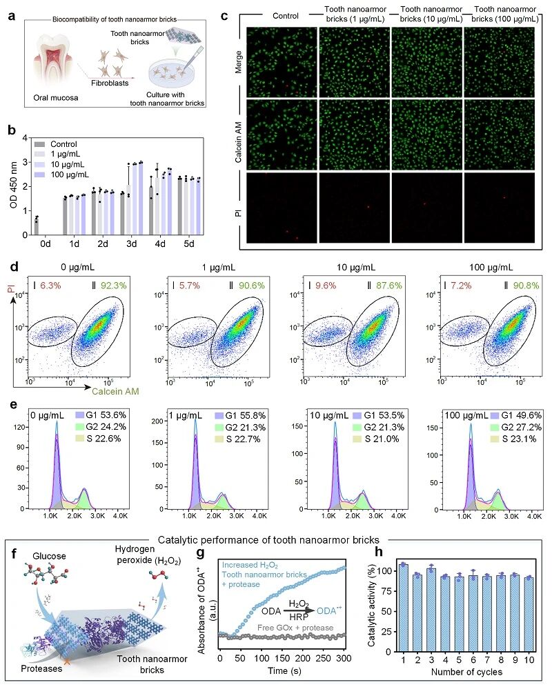 研究团队接下来探索“牙齿纳米盔甲”构建单元生物相容性及催化稳定性,CCK-8与Live/Dead染色未见明显细胞毒性(图3a–c),流式定量显示细胞存活率与对照组想近(图3d)。多酚框架纳米通道允许葡萄糖进入同时阻隔蛋白酶,从而保护GOx催化活性(图3f)。实验显示,在蛋白酶K存在下,游离GOx失活,而“牙齿纳米盔甲”构建单元仍维持催化活性(图3g),循环反应10次仍保留>90%活性,体现高抗降解与可重复催化能力(图3h)。