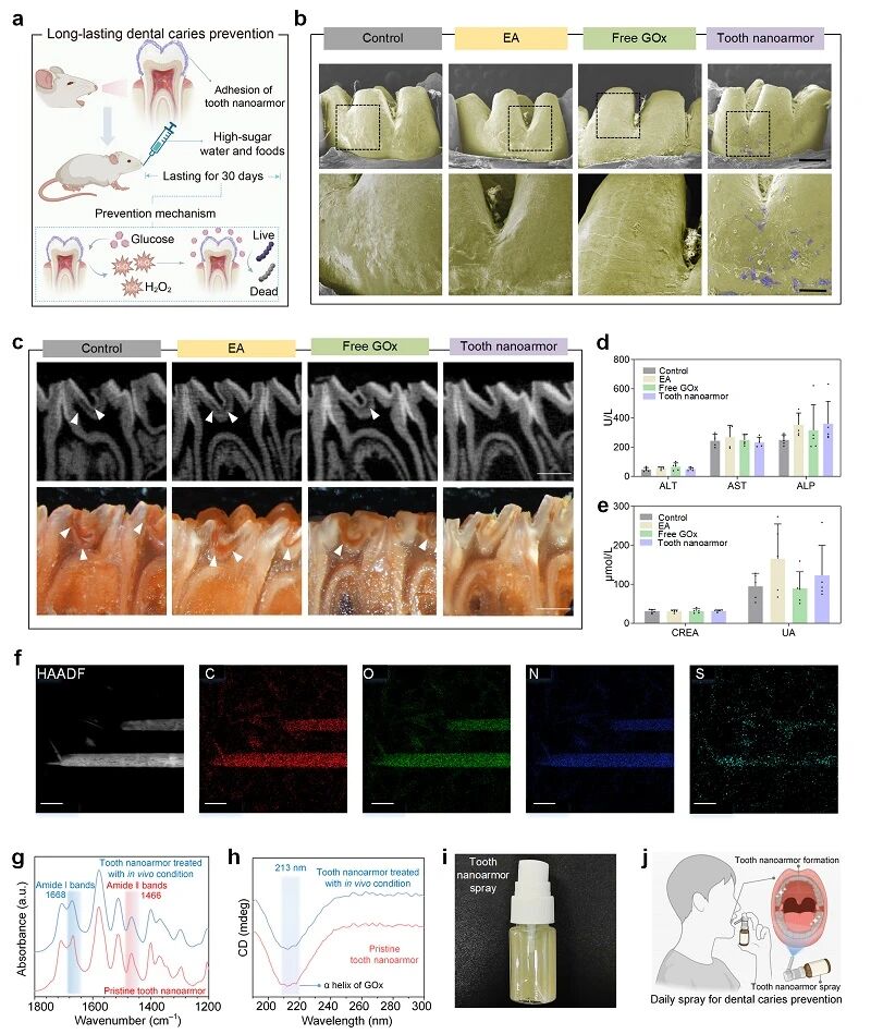 研究团队进而采用大鼠30天致龋模型进行体内实验,“牙齿纳米盔甲”构建单元使用后在牙齿表面形成“牙齿纳米盔甲”,扫描电镜显示“牙齿纳米盔甲”处理组牙釉质表面可见棒状材料附着,且釉质表面更平、脱矿凹坑减少(图5a–b)。micro-CT显示,与对照组相比,“牙齿纳米盔甲”处理组龋病Keyes评分在釉质及牙本质损伤(E、Ds、Dm、Dx)评分上显著降低,牙本质密度升高(图5c)。体内生物安全性方面,血生化与组织学染色未见明显异常(图5d–e)。透射电镜、傅里叶变换红外检测、圆二色谱显示元素分布与蛋白结构信号稳定,证明其在体内相关条件下仍保持结构完整(图5f–h)。研究团队进一步将“牙齿纳米盔甲”制备为水性喷雾,使用后可快速在牙面形成盔甲保护层,有望应用于日常口腔护理(图5i–j)。